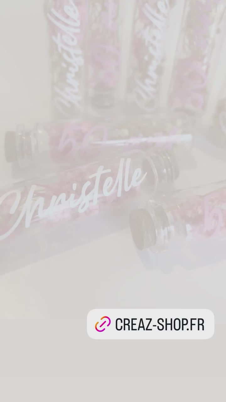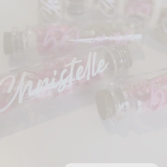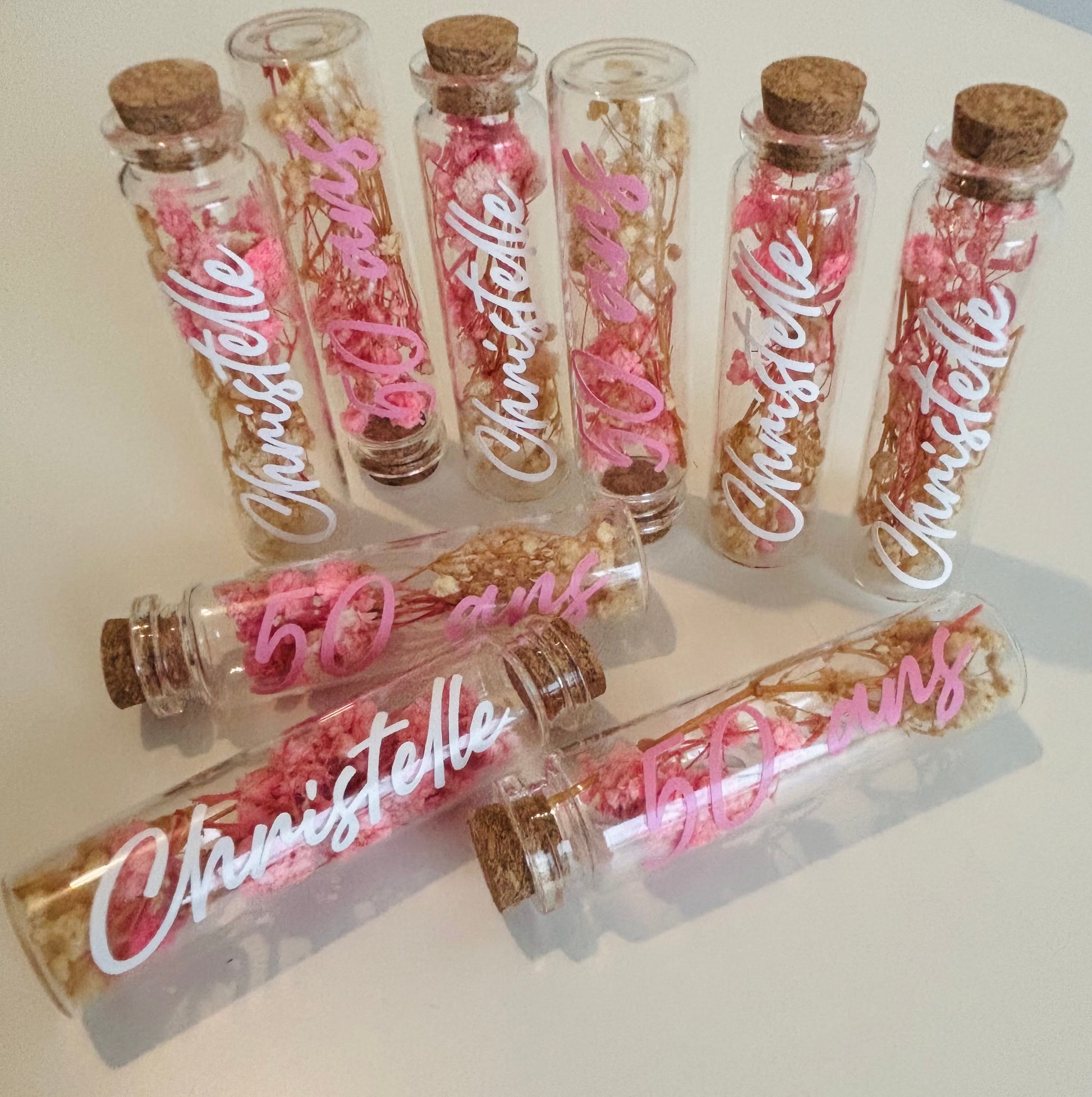 Ajoutez une touche d’élégance et de personnalisation à votre table avec nos fioles porte-noms uniques. Idéales pour marquer les places de vos invités lors de mariages, anniversaires, fêtes ou dîners d’entreprise, nos fioles sont bien plus que de simples porte-noms : elles deviennent un souvenir mémorable que vos invités pourront emporter avec eux. Chaque fiole aura d’inscrit le nom de vos invités et, pour une touche de créativité supplémentaire, remplie de fleurs séchées, de sable coloré ou même de petits messages selon vos envies !
